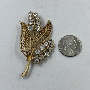 Vintage Coro Brooch Goldtone Textured Leaf With Clear Rhinestones Pin