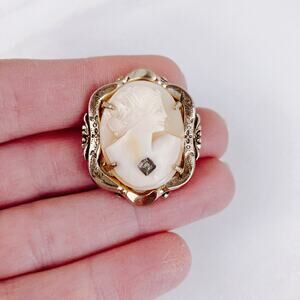 Vintage Coro cameo brooch with a real diamond accent. Carved shell cameo set in a 10K gold-plated metal frame. Features a small genuine diamond at the neck of the cameo.