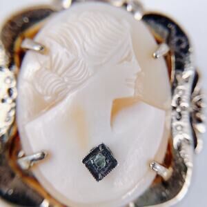 Materials: Shell cameo, 10K gold plating over base metal (brass?), genuine diamond accent (tested)