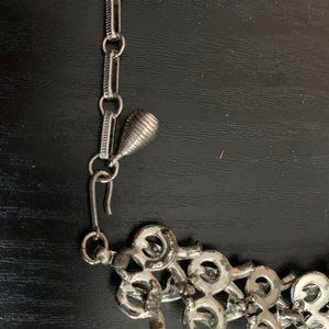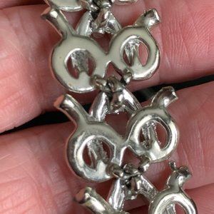 Unique pattern in this silver-tone choker by Coro. Amazingly for the age, it's in like-new condition, showing no wear whatsoever. Adjustable from 12" to 15.25" with a simple hook closure. I've lost one of the pair of matching earrings but I will include one. Highly collectible! Hallmarked on the back of the earring. D1428