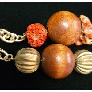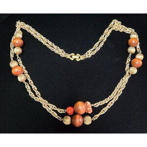 Vintage signed Coro Double-Strand goldtone wood and coral beaded long station necklace. 26" long. Some color loss from wear on wooden beads- see pictures. Otherwise in good vintage condition.