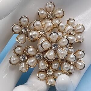 Description: This is a vintage Coro brooch from the 1950s, featuring a floral design with faux pearls and rhinestones set in a gold-tone metal. Coro was a well-known costume jewelry company that produced pieces from the early 20th century until the late 1970s. The brooch is designed as a cluster of flowers, with each flower featuring faux pearl petals and a rhinestone center. This would be a great addition to your jewelry collection or make a great gift!