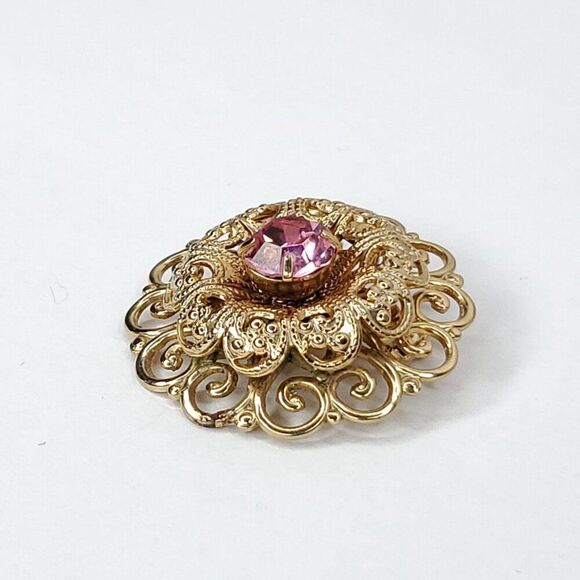 Vintage Coro Filagree Floral Brooch Pink Rhinestone Goldtone 1 3/8"