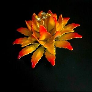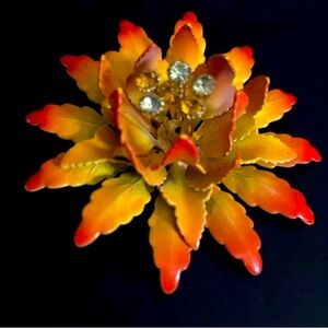Vintage Coro Flower Brooch Pin Yellow & Orange Enamel Metal & Rhinestones
