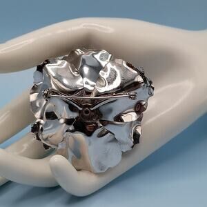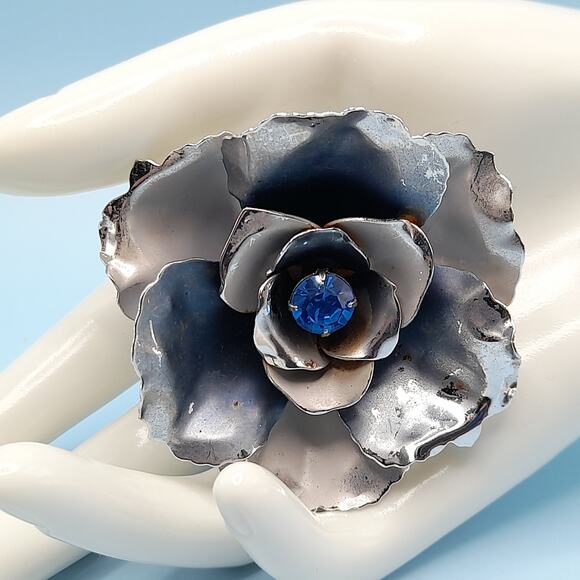 Description: This is a Coro brooch, likely from the 1940s or 1950s, featuring a flower design with a blue rhinestone at its center. The brooch has a silver-tone finish with some darker areas, possibly due to the oxidation or the lighting. The flower has multiple layers of petals, giving it a three-dimensional appearance. This particular brooch is a flower design, a common motif in vintage jewelry. The use of a blue rhinestone adds a pop of color and draws the eye to the center of the flower. The silver-tone finish is also typical of vintage Coro pieces, with some brooches featuring a combination of finishes, such as frosted and shiny silver tone. This would be a great addition to your jewelry collection or make a great gift!