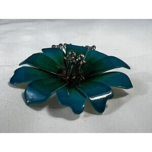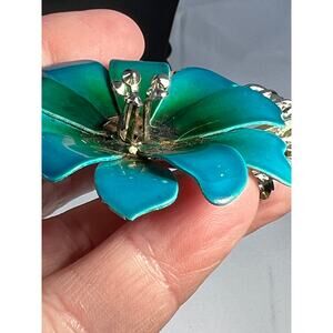 Vintage Coro Flower Brooch Teal Blue Enamel Rhinestone Leaves MCM Ornate RARE