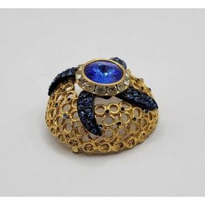Vintage Coro Gold Tone Blue Rhinestone Dome Shaped Brooch Pin. Good Pre-owned condition with minor signs of wear and several tiny blue stones missing around the dome
