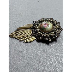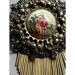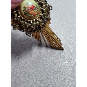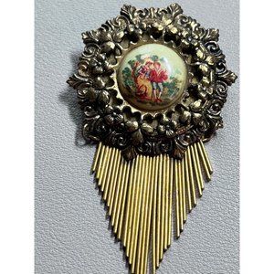 VIntage Coro Brooch. Gold Tone. Centerpiece is a painted picture of a young couple. Metal graduated fringe that adds some fun movement to this piece. From the 1930's.