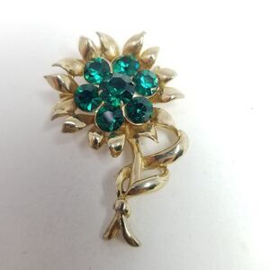 Vintage Coro Green Rhinestone Flower Shape Brooch, Gold Tone Setting, Signed