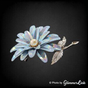 Vintage Coro silver tone brooch featuring an open flower with iridescent blue enamel petals and a faux pearl center.