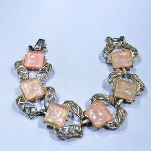 *Description: This is a mid-century Coro link bracelet in gold tone with pink Lucite confetti squares from the 1950s. The Lucite pink squares are filled with translucent colorful confetti which glistens in the light. The bracelet is 7 inches in length with a fold over clasp. This would be a great addition to your vintage jewelry collection or make a great vintage gift!