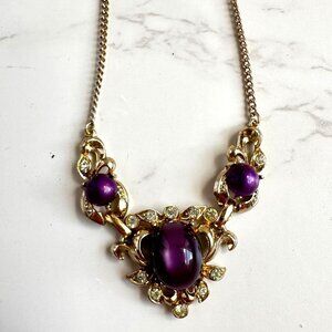 A bold vintage Coro statement necklace featuring rich purple cabochons, sparkling rhinestones, and elegant mid-century gold-tone filigree — a true standout piece of signed vintage jewelry.