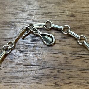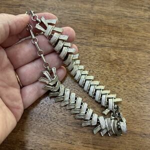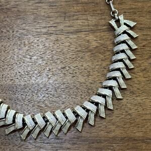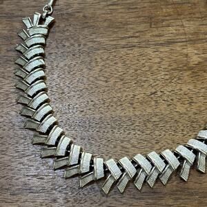 This Vintage Coro Necklace in textured silvertone panel chain is a statement piece that exudes a retro Egyptian revival style. The choker collar design with a hook closure makes it versatile for various occasions such as engagement, wedding, or birthday celebrations. The necklace, measuring 17 inches in length, features a panel chain style and is signed by the brand Coro. Made in the United States during the mid-century era, it showcases a unique blend of vintage charm and timeless elegance. In good vintage condition - totally wearable and just stunning!