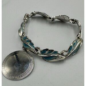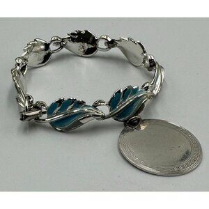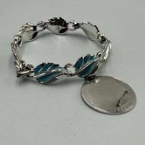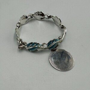 Vintage Coro Pegasus Bracelet Silver Tone Blue Leaf Large Circle Dangle Charm 7"