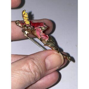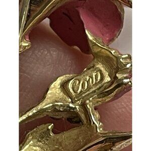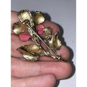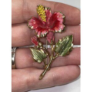 Vintage Coro Pink Red Yellow Hibiscus Flower Brooch Pin Rhinestones Gold-Tone