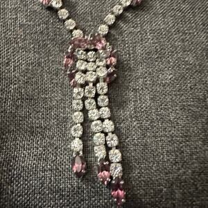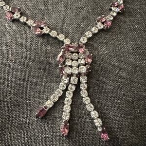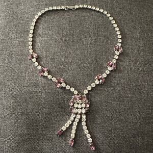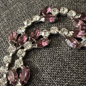 Signed: Coro. Purple & clear rhinestones, silver t0!3 metal. Necklace length:24.5”. In great condition- item is pre-owned vintage, see photos for any signs of light wear.