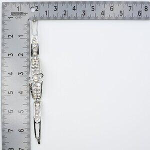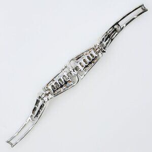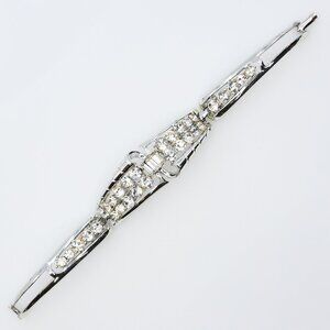 This is a vintage 1950s Coro bracelet featuring brilliant clear rhinestones in a rhodium-plated silver-tone setting. The design showcases a raised center with rows of round and baguette-cut rhinestones, tapering toward the sides in a sleek, geometric motif. The bracelet has a sturdy hinged construction with a secure box clasp and safety catch, and is signed Coro in script on the clasp. A beautiful example of Coro’s postwar glamour—perfect for bridal, formal, or vintage-inspired wear.