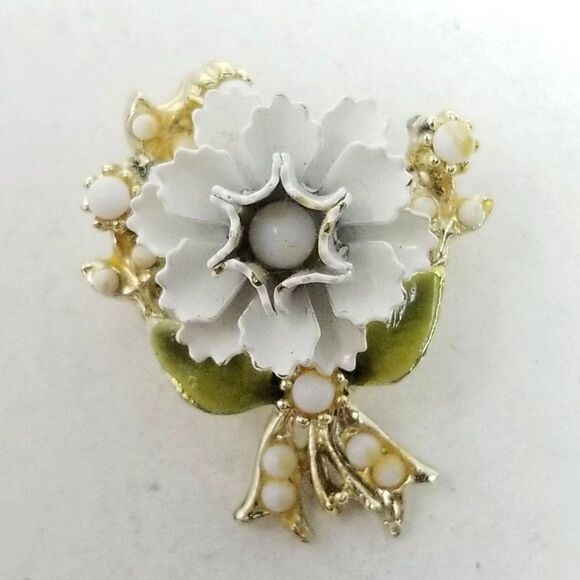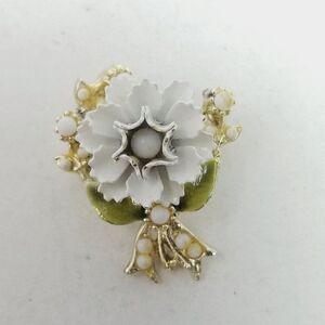Vintage Coro White Flower Enamel Brooch, Signed Lapel Pin, Retro Estate