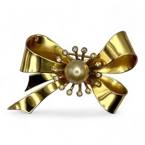 Vintage 90’s Gorgeous and great condition beautiful design Coro signed Gold tone Bow with faux pearl and rhinestones ladies Brooch Pin