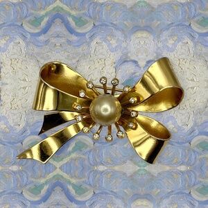 Vintage 90’s Gorgeous and great condition beautiful design Coro signed Gold tone Bow with faux pearl and rhinestones ladies Brooch Pin