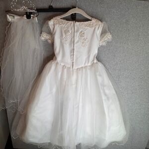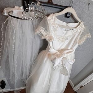 Keywords: girls dress, ivory dress, communion dress, flower girl dress, wedding dress, party dress, tiara, veil, special occasion, formal wear, lace trim, tulle skirt, ribbon bow, costume