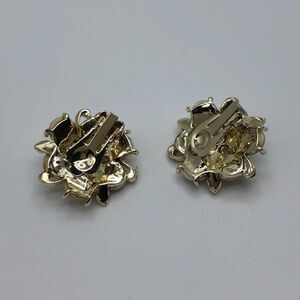 Vintage gold tone clip on earrings with clusters of mother of pearl colored rounded discs. 1 1/8 inch diameter. Some minor discoloration to the glue due to age.