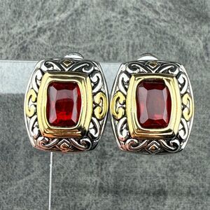 Vintage costume ornate gold-silver-tone metal clip-on earrings with red faceted rectangular glass rhinestone.