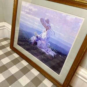 The framed image is a print titled "Girl in a Field of Flowers" or "Quiet Moment" by the artist B.R. Greene.