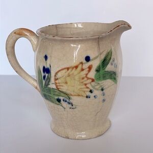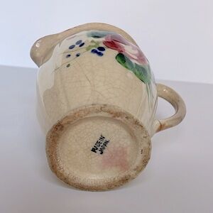 Vintage cottage creamer pitcher with hand painted roses and flowers. Made in Japan, very old likely antique. Condition shows crazing, superficial cracks all expected with this age of use, however the pitcher is in solid condition. Great for a collection. Crème with pink, green, royal blue and yellow paint.