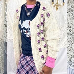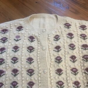 Creamy eggshell vintage cardigan with bobbles and little purple flowers. No tags are present, however it definitely feels as though its wool or a wool blend.