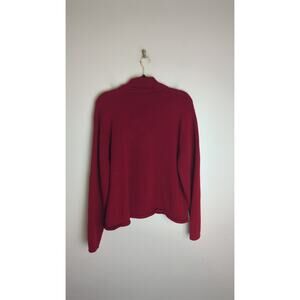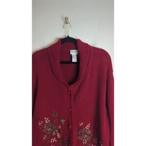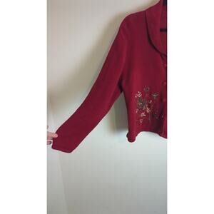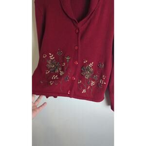Beautiful tight knit ,deep red Cardigan, button down, no pockets, embroidered patchwork beaded.