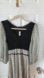 This elegant women's dress features a sophisticated lace trimmed black bodice paired with a flowing greenish and tan patterned skirt. Sheer patterned puff sleeves. Elastic in sleeves has some dry rot but can be replaced or worn as is. Flowy skirt has stretch. Back zip and sash that ties in back. Perfect for any occasion, this dress combines style and comfort effortlessly. Very unique vintage piece. Size S...see measurements