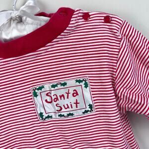 Vintage Cotton Club Santa Suit Christmas Coverall. Baby boy or girl size 6-9 months. The cutest one piece romper outfit for sleep or play! Red and white stripes with a big Santa print on the back. Snaps on the shoulder and along the legs for easy on/off.