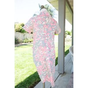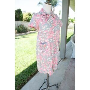 Floral Homemade Cotton Dress Pink and Gray blossum fabric with two open front pockets with bow embellishment, tie front neck and front button down closure with the cutest retro, pink buttons, cap sleeve and adorable collar