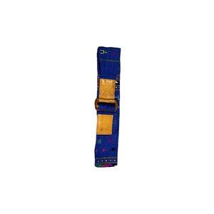 This vintage 80s belt is made of leather ends and a wide cotton woven body with multi-colored thread embroidered accents. There is no size on the belt, but appears to be a small. See picture with measurement.
