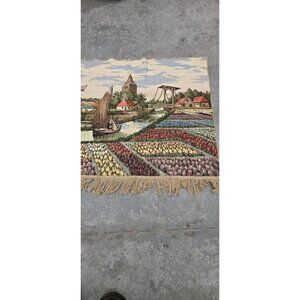This vintage cotton tapestry depicting a Dutch scene with tulips and windmills would make a charming addition to any home décor. With its retro style and origins in the Netherlands, this tapestry brings a unique and traditional touch to living spaces. Measuring 60x30 inches, it is a versatile piece that can be hung on walls or displayed on dining room tables for a touch of European flair.