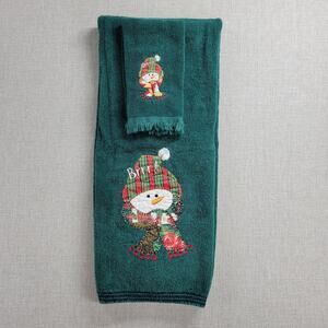 Vintage Cotton Terry Cloth Holiday Towel 2pcs Set Green Winter Snowman Holiday