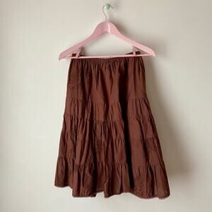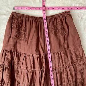 Super cute 100% cotton chocolate brown vintage midi length skirt with an elastic waistband and brown floral embroidery by brand- Zero Zero. Size medium. Measurements in photos.