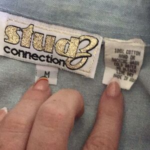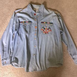Stylish denim shirt with colorful embroidery. Features unique designs on the front pockets.