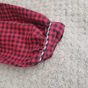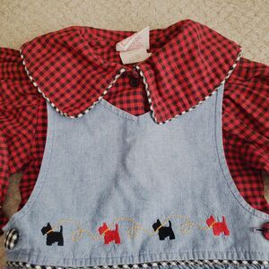 This vintage outfit is to die for! Pilgrim collared red and black checked long sleeved button up blouse, with contrasting black and white checked trim around collar and wrist cuffs. The denim jumper is sleeveless and has a dropped waist. Scotty dog embroidery on jumper along with red and black checkered buttons. Good condition. Would be perfect for back to school pictures!