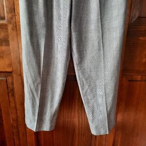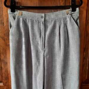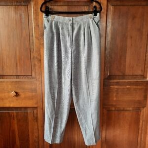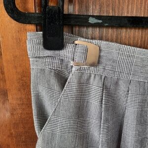 Vintage Counterparts Petites high-rise black & white glen check plaid trouser pants. Button and zipper fly closure, unique waist clinching metal slide tabs, 2 large hip pockets, pleats, and a slight tapered pant leg. In excellent condition! Very unique pair of pants! Light weight material 70% polyester 30% rayon. Vintage size 14, fits like a modern 10. See measurements below.