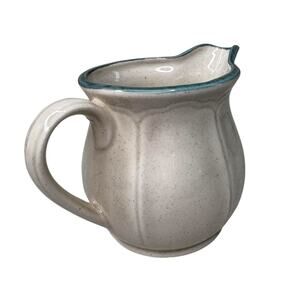 Charming vintage ceramic creamer from the Country Classics Collection by Action Japan. Features a sweet hand-painted design of white ducks or geese surrounded by pink and blue flowers with gray leaves. Classic speckled off-white glaze and teal rim.