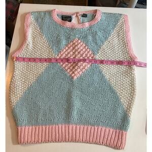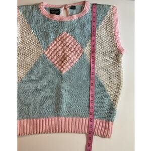 Step back in time with this charming vintage 80's Country Craft hand-knitted sweater vest! This unique piece features a delightful combination of pink, blue, and white in a cozy, chunky knit. The keyhole back adds a touch of elegance, complete with a button closure. Made from a blend of 55% ramie and 45% acrylic, this vest offers both comfort and style.