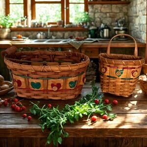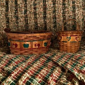 Bring cozy farmhouse charm into your space with this matching set of vintage woven baskets featuring heart-and-button accents in deep green, red, and mustard tones. Each basket is hand-woven with a warm honey finish, decorated with painted patchwork-style hearts and wooden buttons for that nostalgic country-home look.