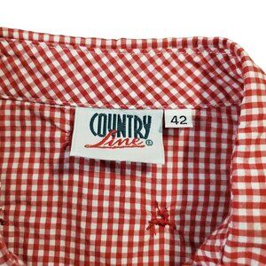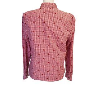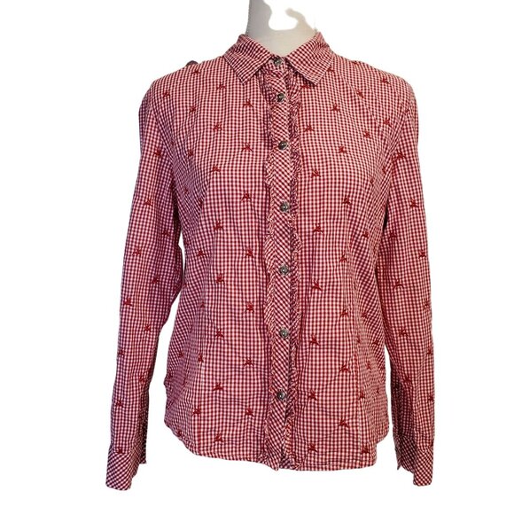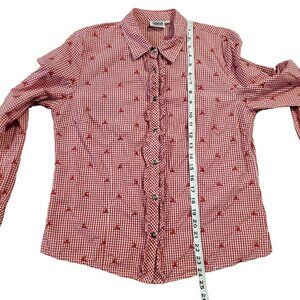 Vintage Country Line Red & White Gingham Embroidered Reindeer Ruffle Button Top Women's Small