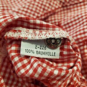 Excellent condition. Embroidered reindeer over red and white gingham pattern. Ruffle front with metal buttons. 100% cotton with extra button attached to garment care tag. This is vintage and not sized in the U.S. Please see measurements in photos and confirm size before purchasing.