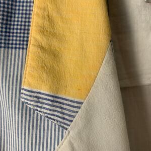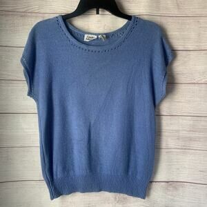 Blue sweater is a MEDIUM. 55% ramie (linen) and 45% cotton. Hand wash cold, dry flat, or dry clean.