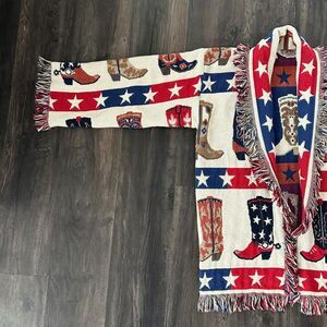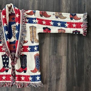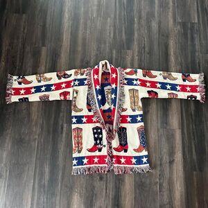 Collared fringe end blanket made jacket with cowboy boots and stars, red, white, blue, USA themed print all over. Thick and warm. Long sleeve. Open front, no closure. 100% Cotton.