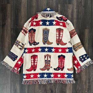 Vintage Country Western Tapestry Blanket Sweater Coat Boot Star Pattern Fringe