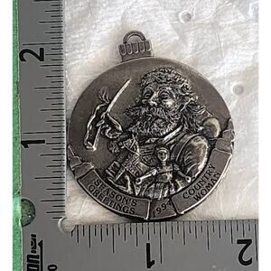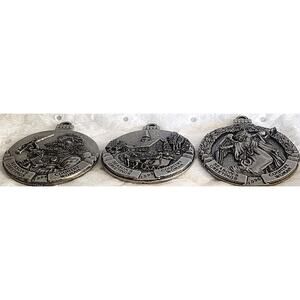 Nice set of 3 pewter ornaments given out by Country Magazine . Each ornament is 2 inches round . Each has a hanging loop for easy display so all they need is a string of ornament hook to display. These are in nice condition and have always been wrapped up when not in use.